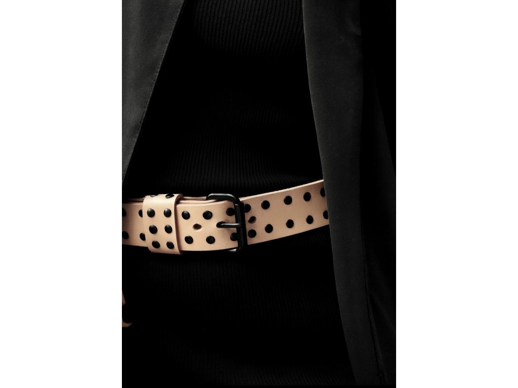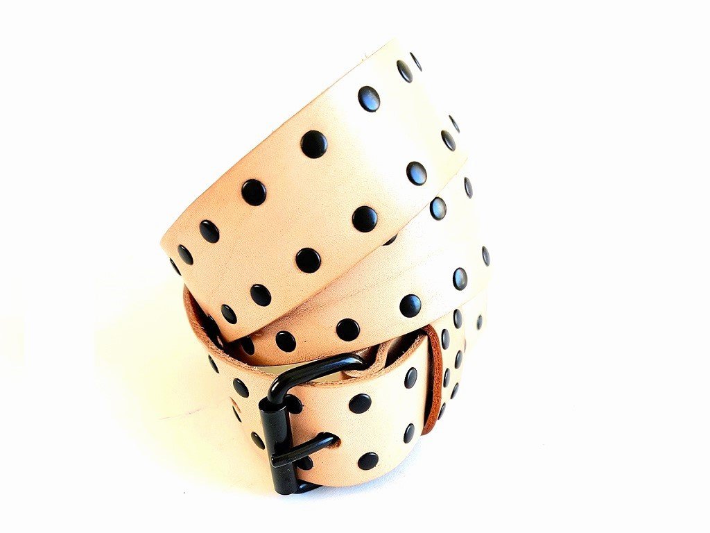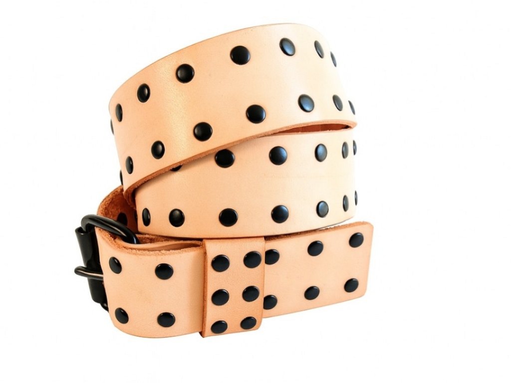 Ručně vyrobený opasek z hovězí kůže o síle 3,5 mm. Šířka opasku je 4 cm, doplněná o černou přezku a dekorativní nýty v jednotném matném provedení. Povrch je ošetřen včelím voskem, který zvýrazňuje přirozenou kresbu kůže a zároveň ji chrání.