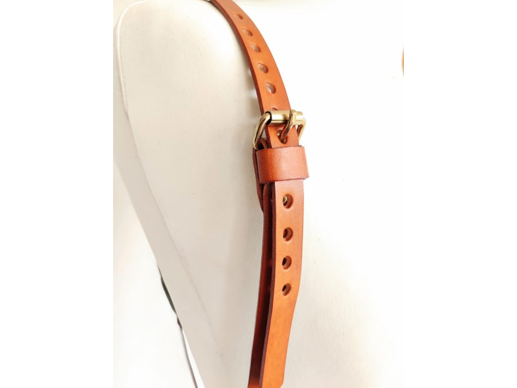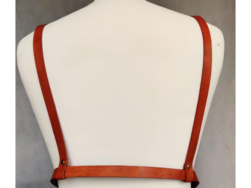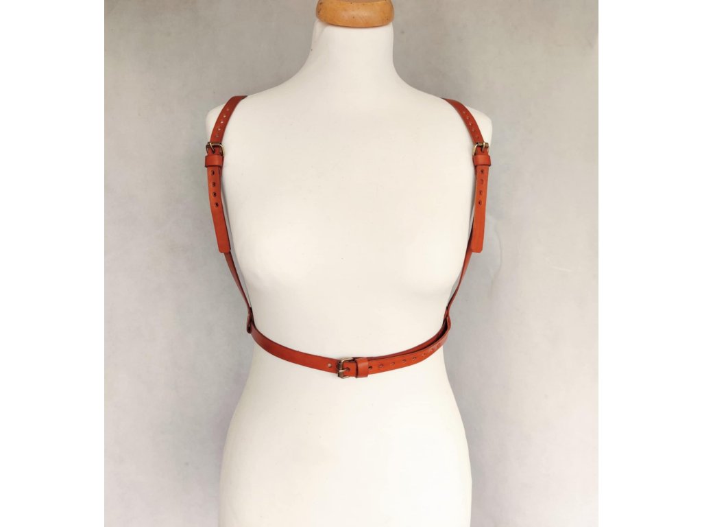 Elegantní dámský harness je vyroben z kvalitní pravé kůže o síle 1,5 mm. Jeho jemný a minimalistický design doplňuje mosazné kování, které zajišťuje nejen stylový vzhled, ale i dlouhou životnost. Vše je pečlivě zpracováno ručně, s důrazem na detail a pohodlí při nošení.