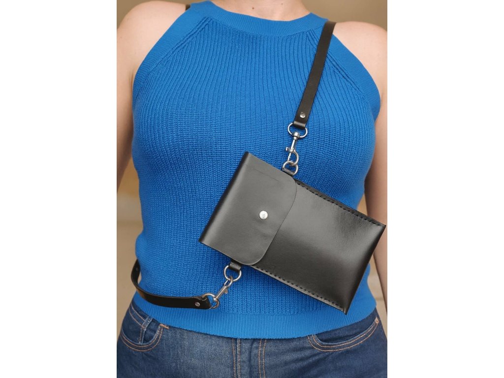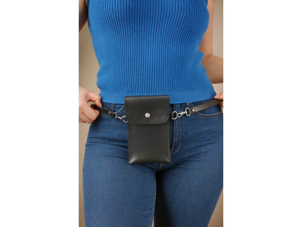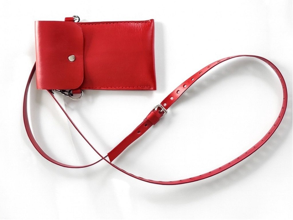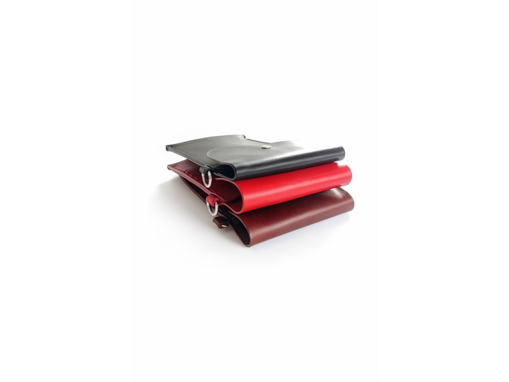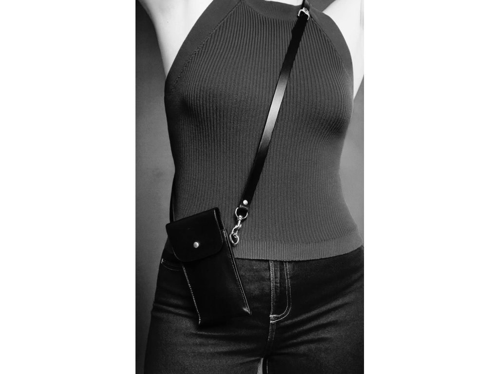 Součástí pouzdra je nastavitelný kožený popruh, který umožňuje pohodlné nošení různými způsoby. Lze jej nosit přes rameno, napříč tělem, kolem pasu nebo připnutý k opasku jako stylový doplněk, který máte vždy po ruce. Kování je pevné a ladí s celkovým elegantním provedením.